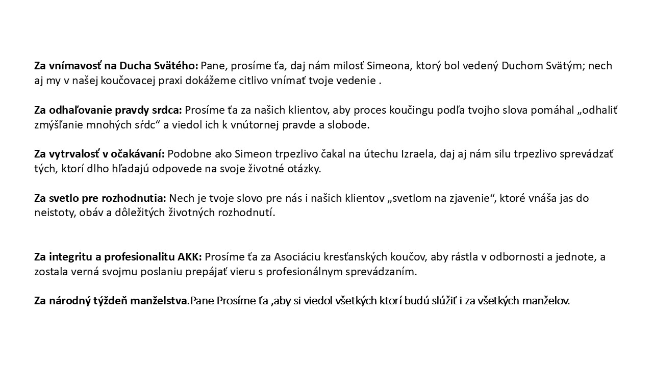 Pane, uč ma vidieť, kde je môj skutočný poklad. Očisť moje srdce od toho, čo ma rozptyľuje a veď ma k tomu, čo má večnú hodnotu. Daj, aby som ako kouč/ka vychádzal/a z ticha, pravdy a lásky a aby moje slová aj mlčanie boli miestom, kde sa môžeš dotknúť sŕdc druhých. Amen.